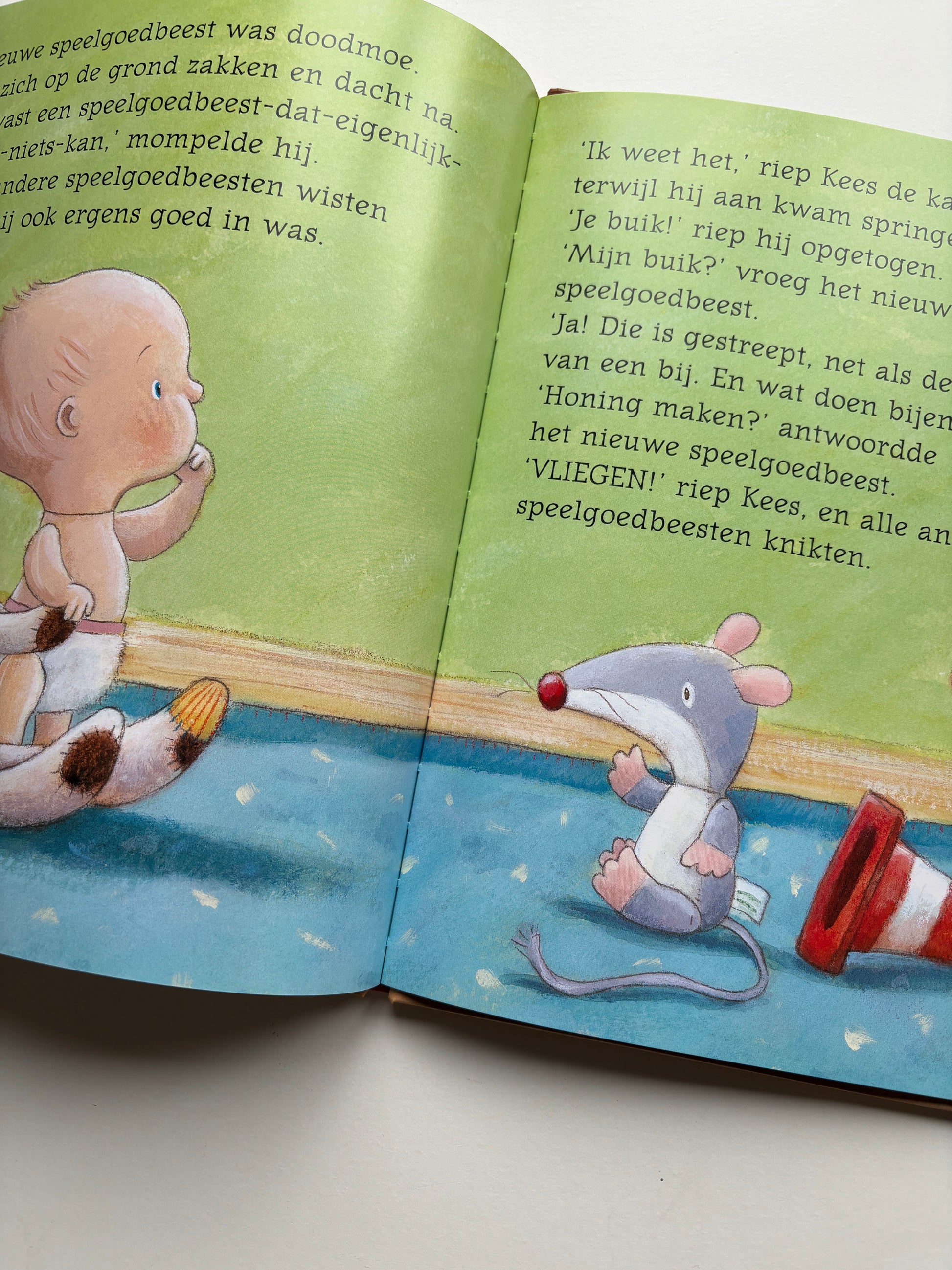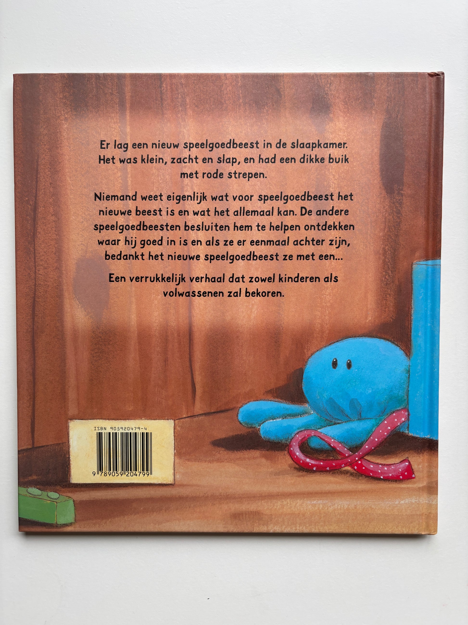 Er lag een nieuw speelgoedbeest in de slaapkamer. Het was klein, zacht en slap, en had een dikke buik met rode strepen.