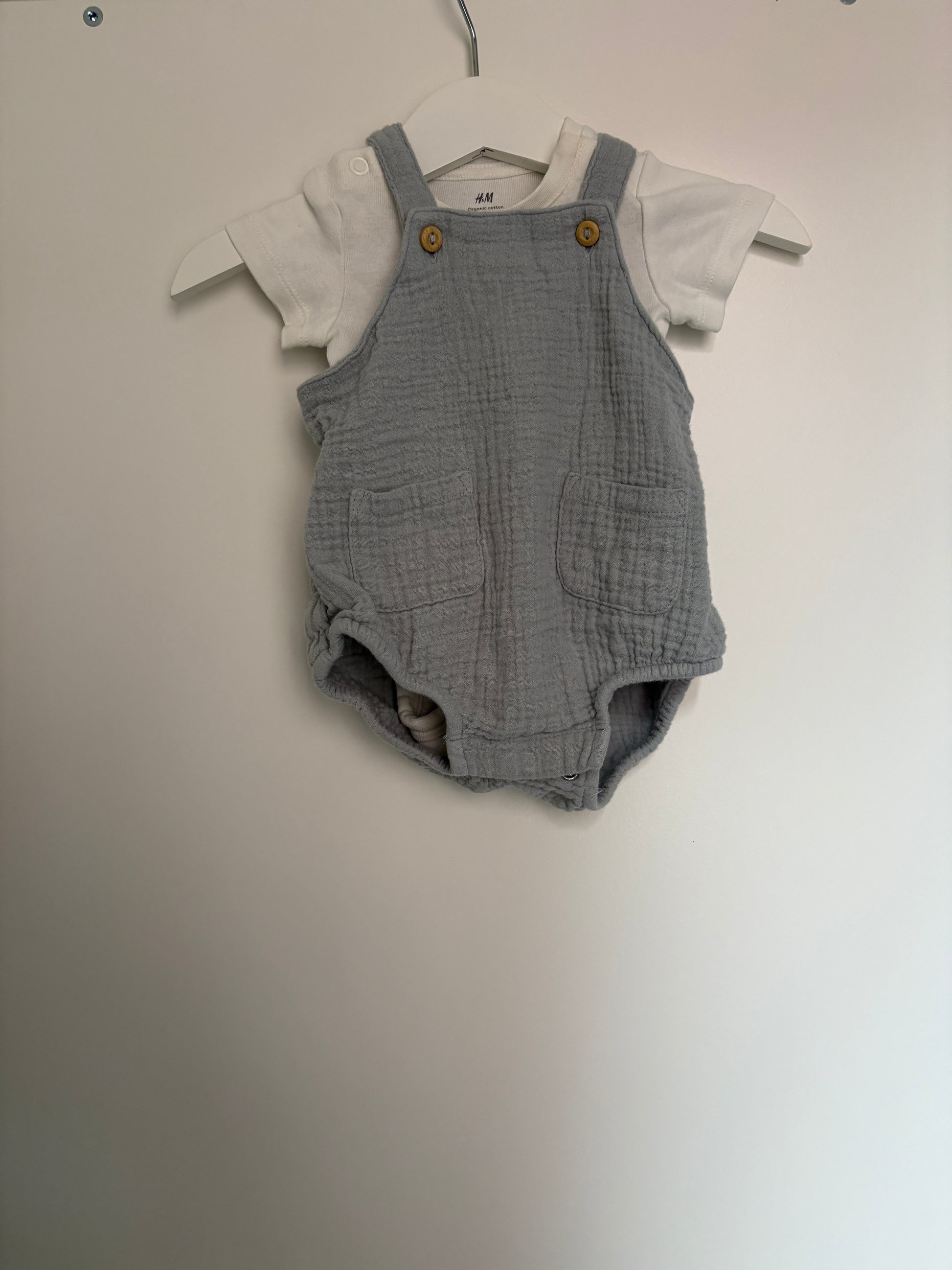Setje: witte romper met korte mouwen en blauwgrijze salopette