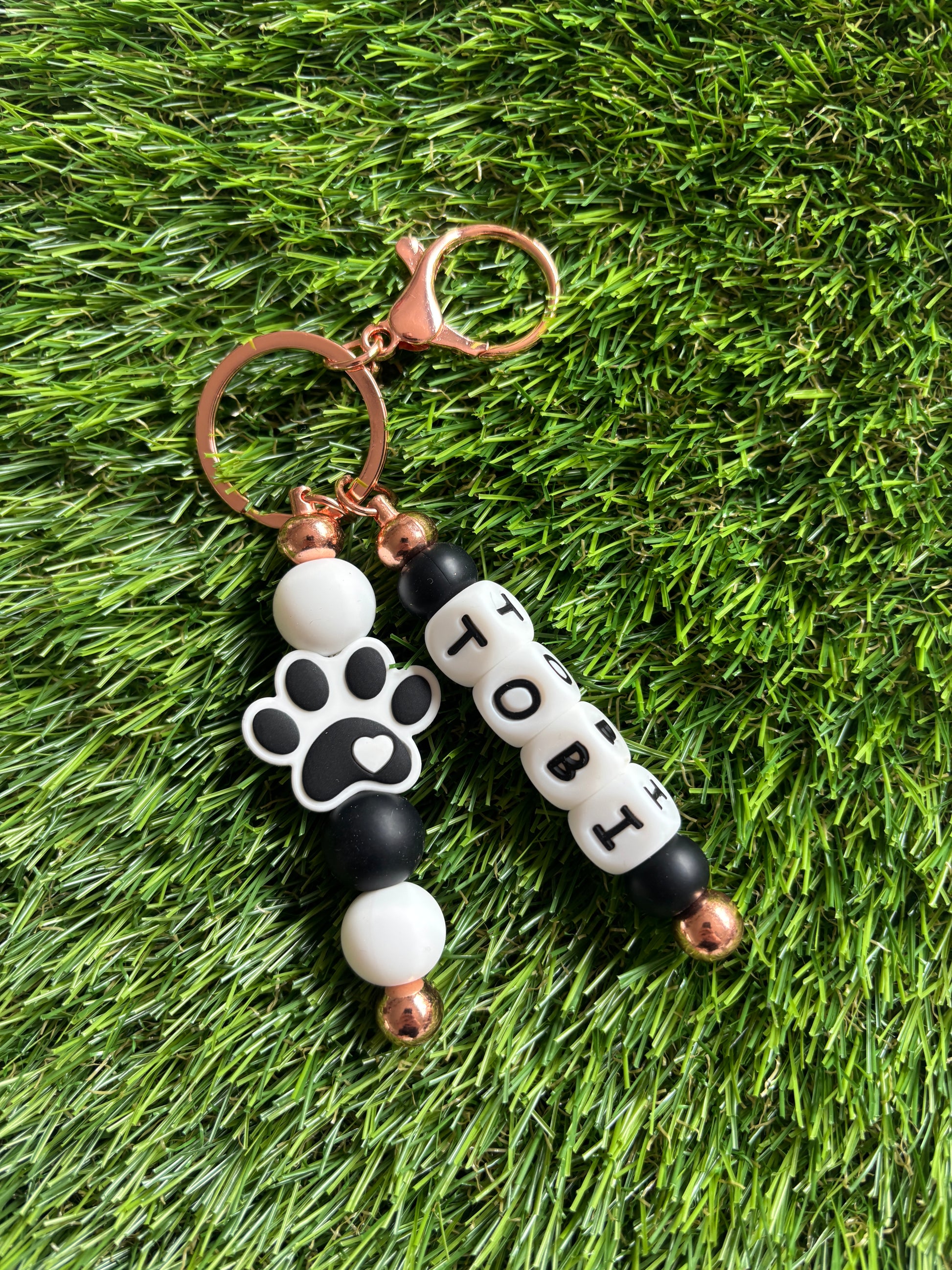 Sleutelhanger met naam, musketonhaak en figuurtje